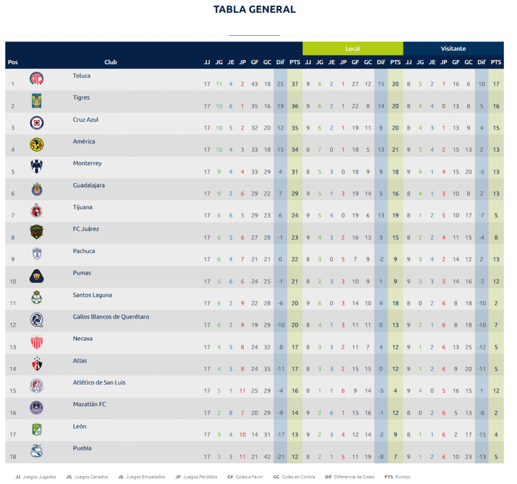 JORNADA 17 LIGA MX, DEJA A TOLUCA DE LIDER Y TRES CAMPEONES DE GOLEO